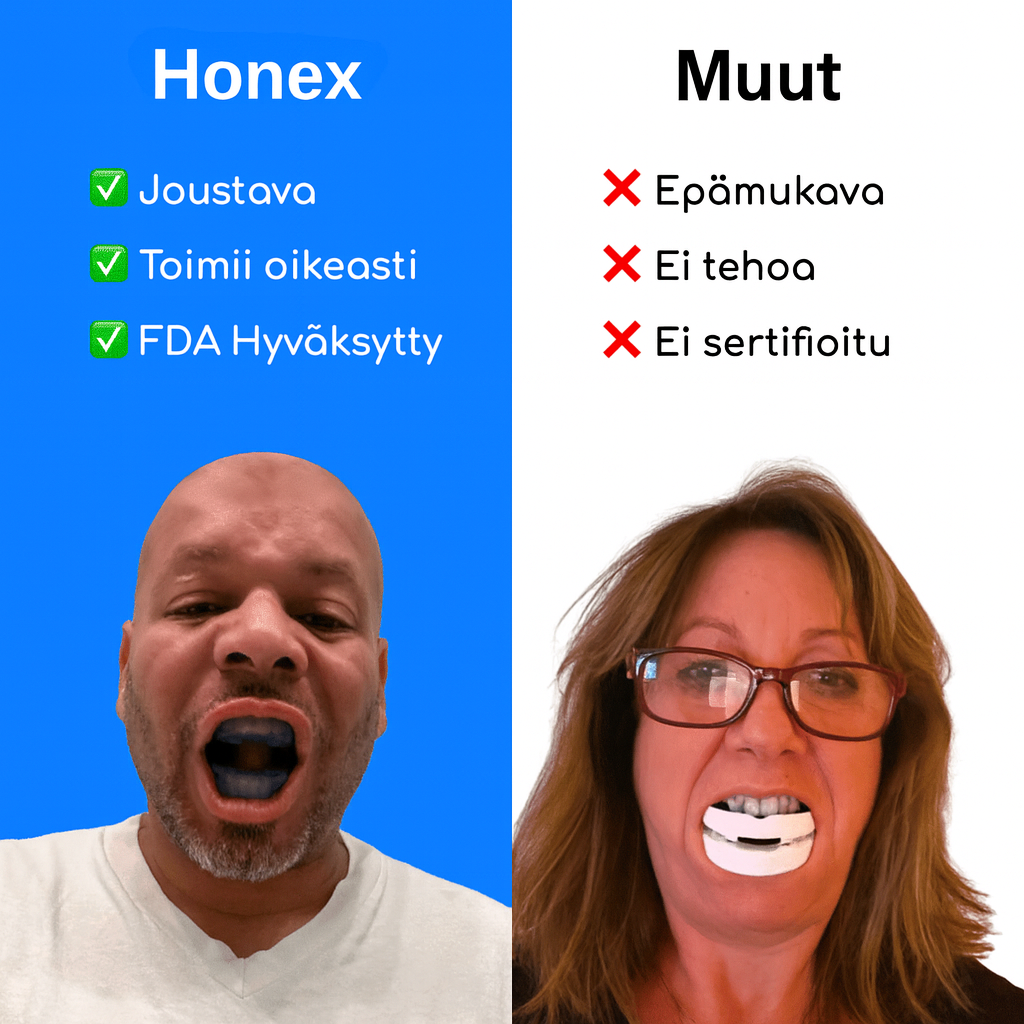 Sen ainutlaatuisen rakenteen ja elastisten materiaalien ansiosta voit nukkua suu auki tai kiinni – kun taas muut ratkaisut pakottavat puristamaan hampaita, mikä aiheuttaa kipua leukaan.